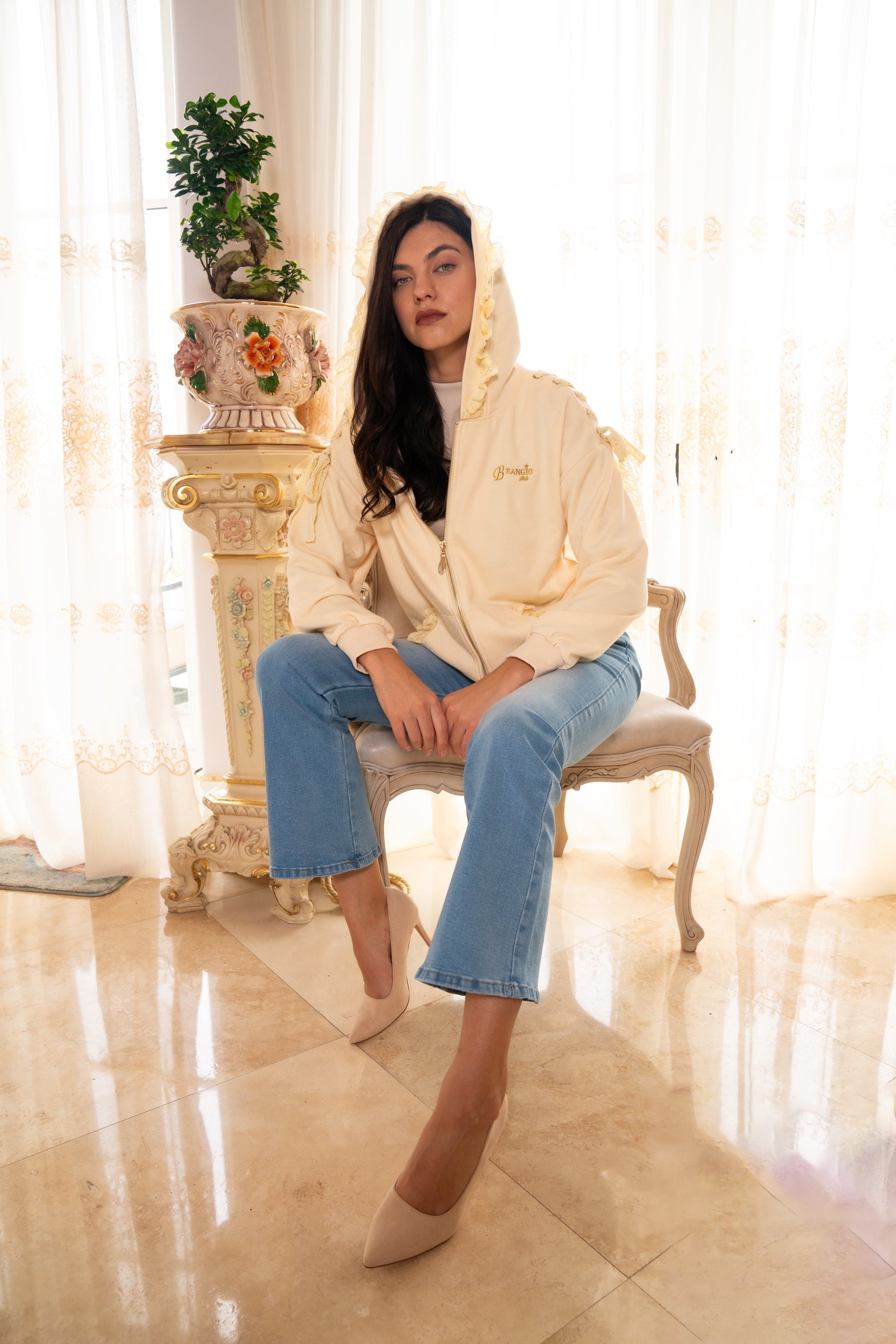 Wrap yourself in elegance and comfort with this vintage-inspired lace-trimmed hooded zip-up jacket. A perfect blend of cozy meets chic, this piece adds a romantic flair to your everyday wardrobe.