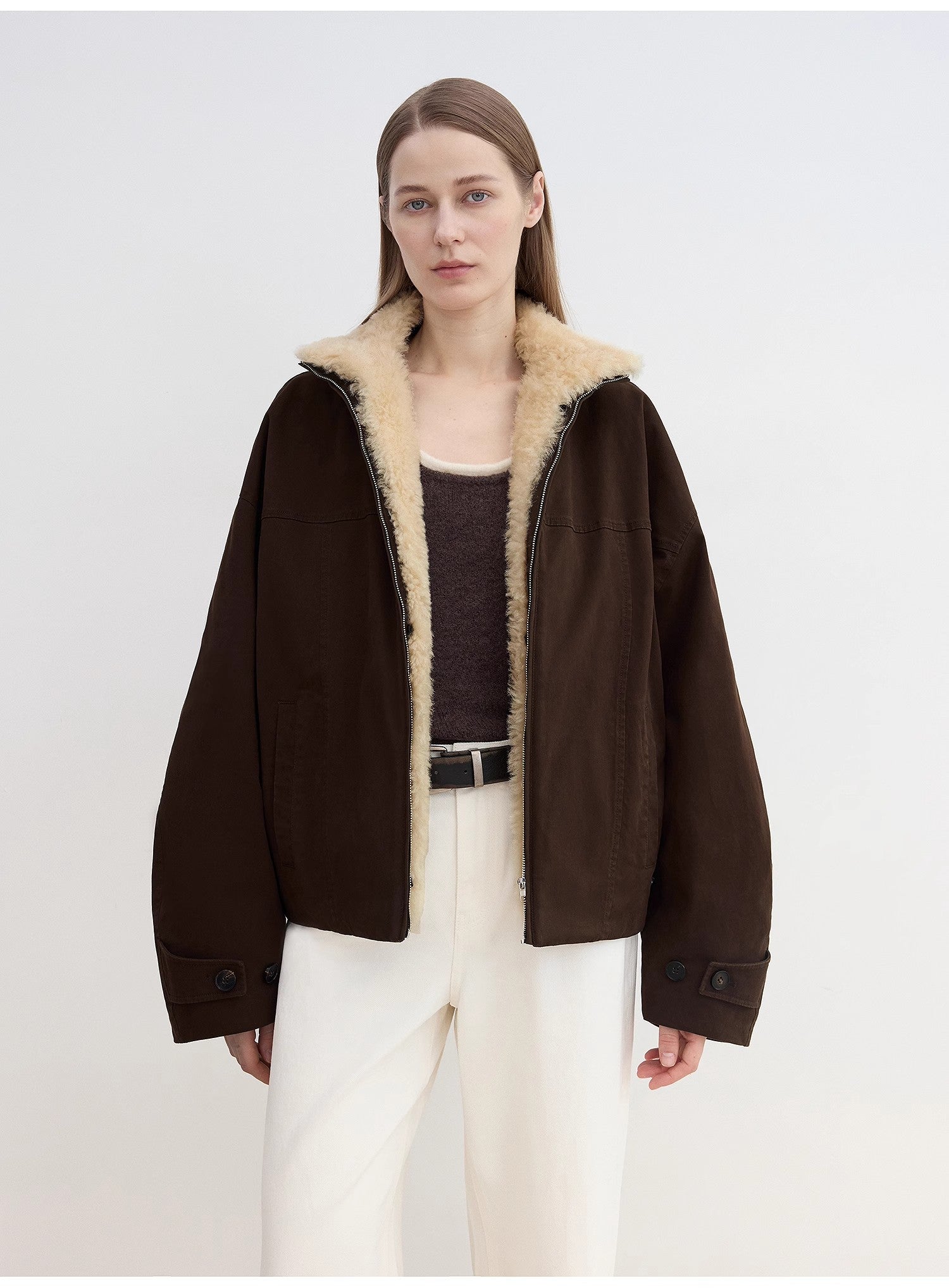 🧥 Detachable Shearling Collar — Soft Tuscan curly fur in contrasting color, adds warmth and versatility