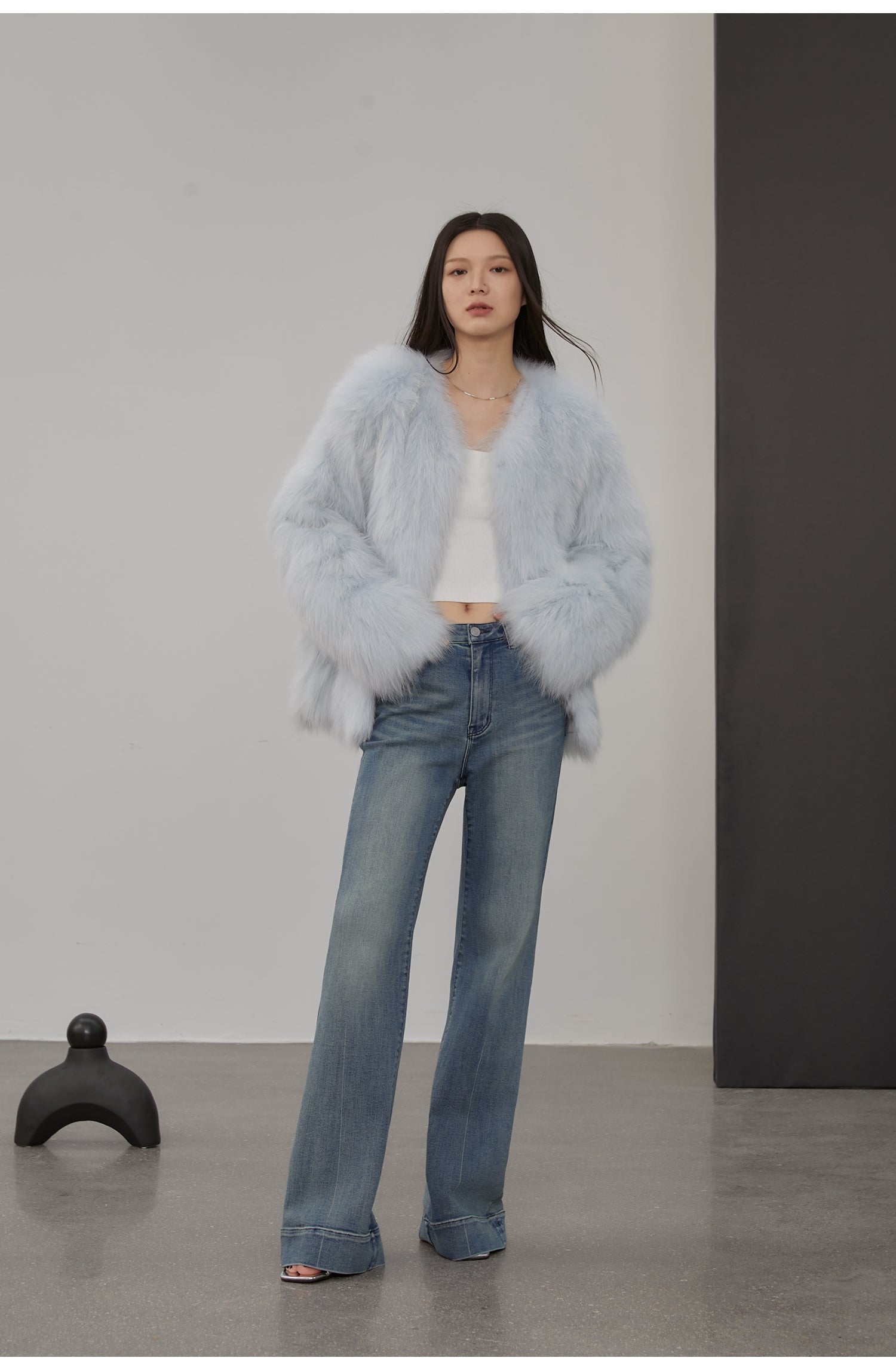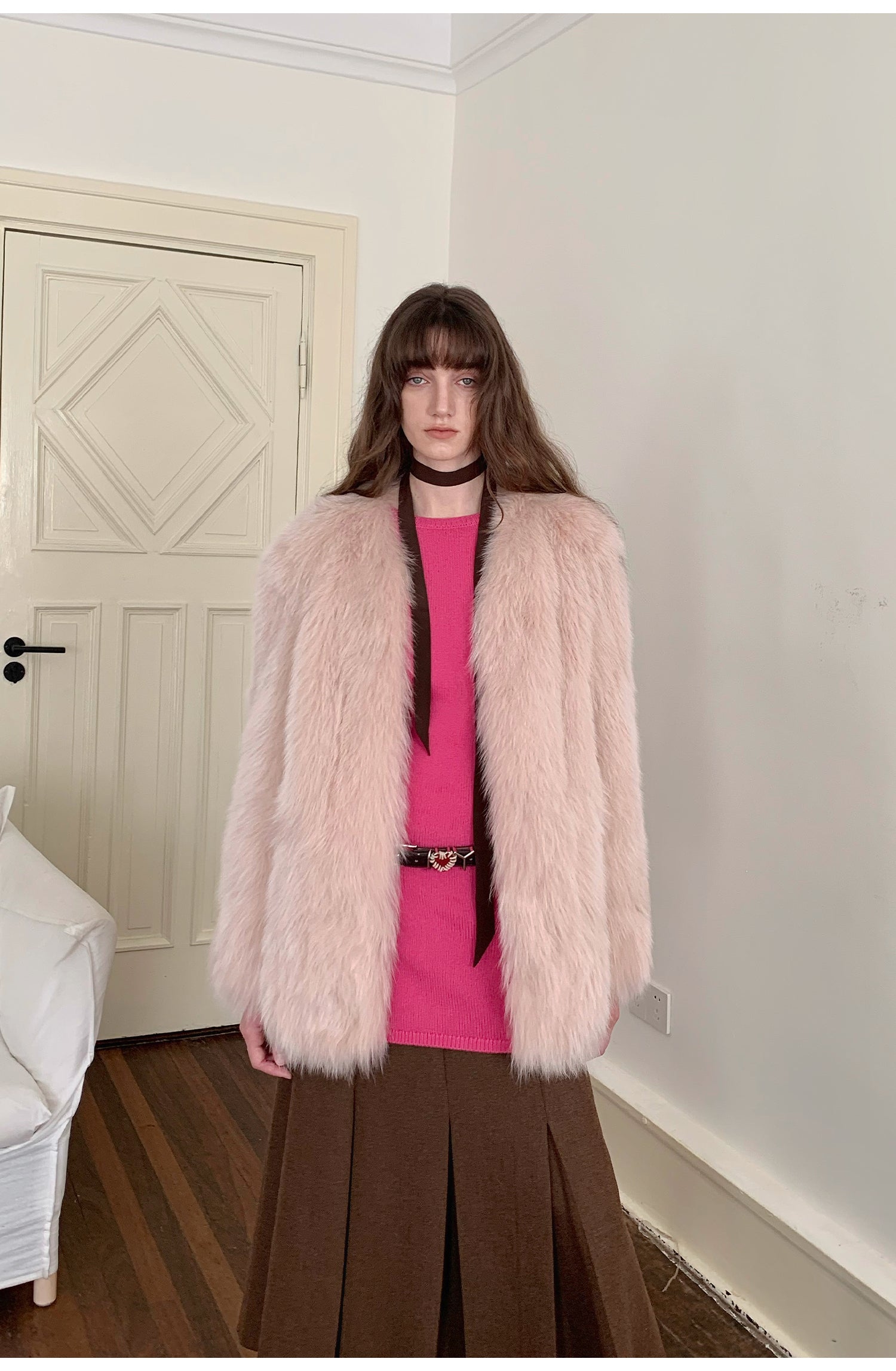 Expertly tailored V-neck overlapping closure enhances the neckline and adds structure to the soft, flowing fur.
