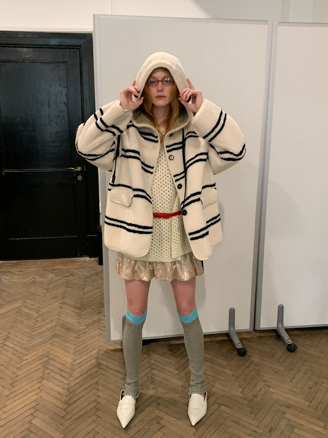 Each jacket features hand-inlaid horizontal stripes, created by carefully cutting and stitching hand-dyed Merino wool pieces. The result is a visually harmonious pattern that highlights the natural beauty of the fur.
