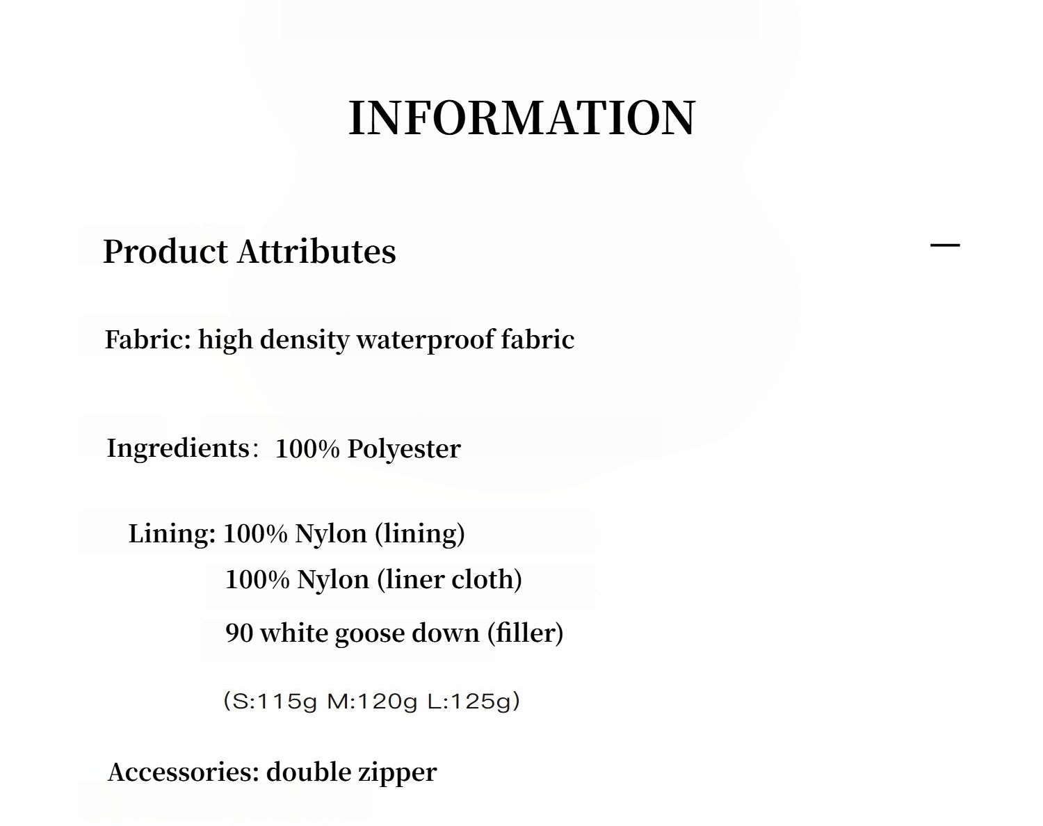 90% white goose down ensures excellent insulation and heat retention for cold weather.