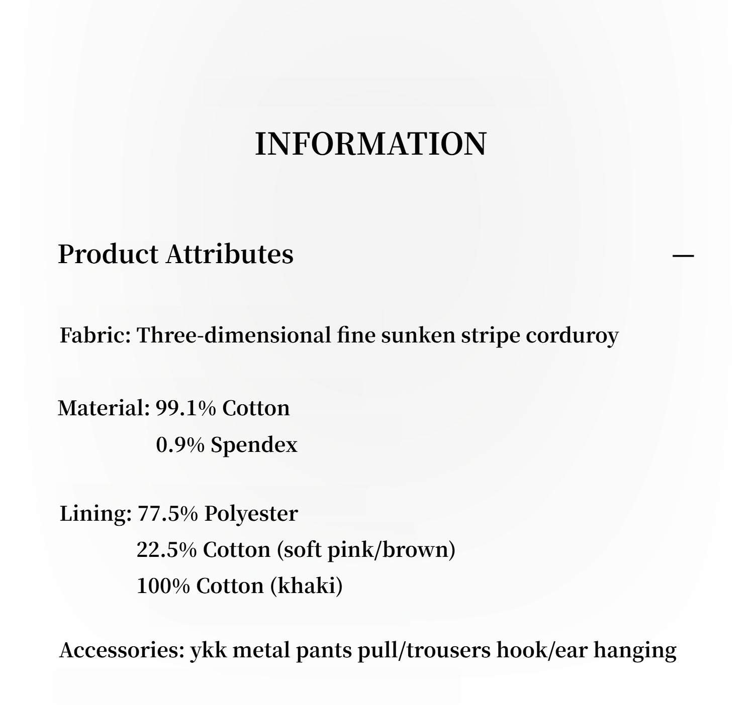 Care: Thick corduroy retains heat, resists wrinkles, and is low-maintenance